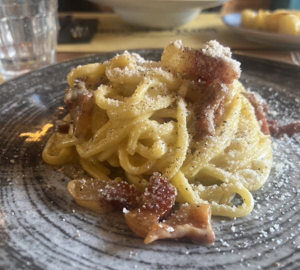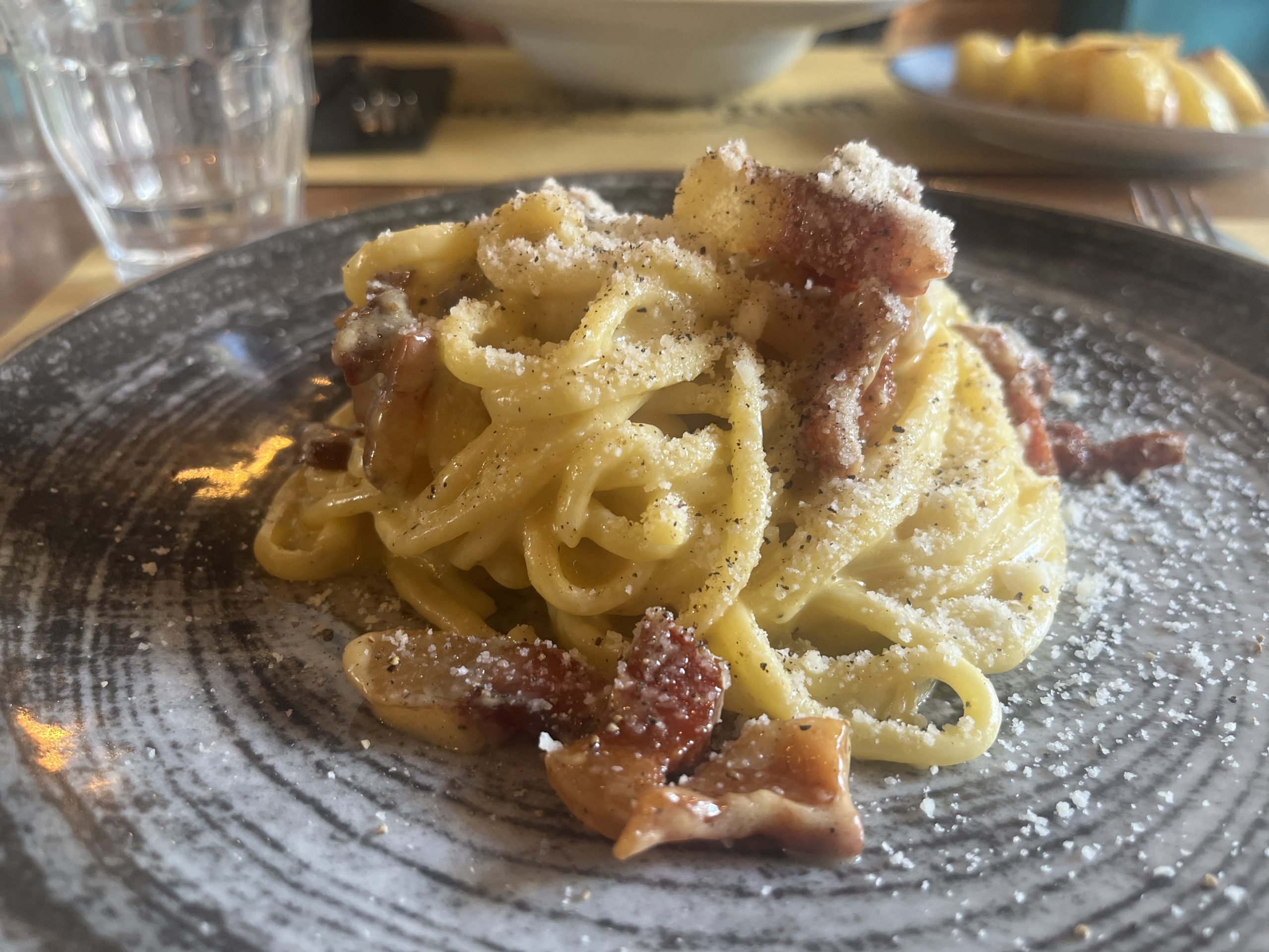 Večerjo zaključite z drugo tradicionalno specialiteto: carbonara. Prava rimska carbonara ne vsebuje smetane – samo jajca, guanciale, pecorino in črni poper. Enostavno, a nepozabno.